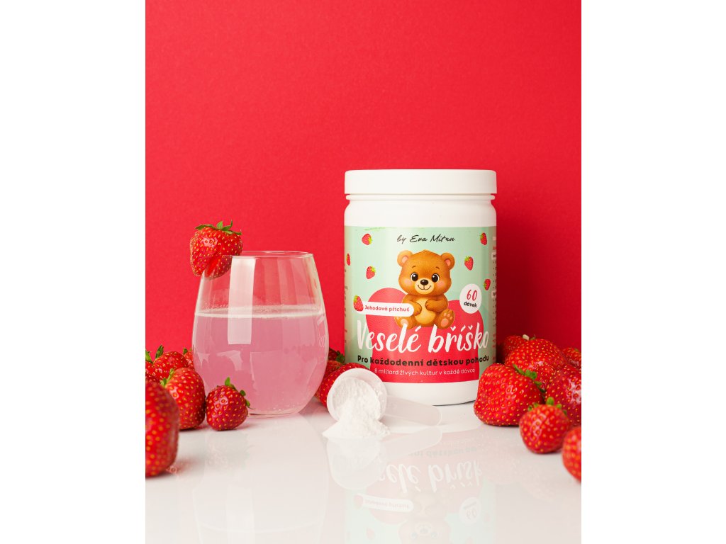 Veselé bříško je jemný doplněk stravy s jahodovou příchutí, který podporuje zdravé trávení, imunitu a dobrou náladu dětí. Každá dávka obsahuje 8 miliard živých kultur a speciální směs enzymů, které napomáhají lepšímu trávení a vstřebávání živin.